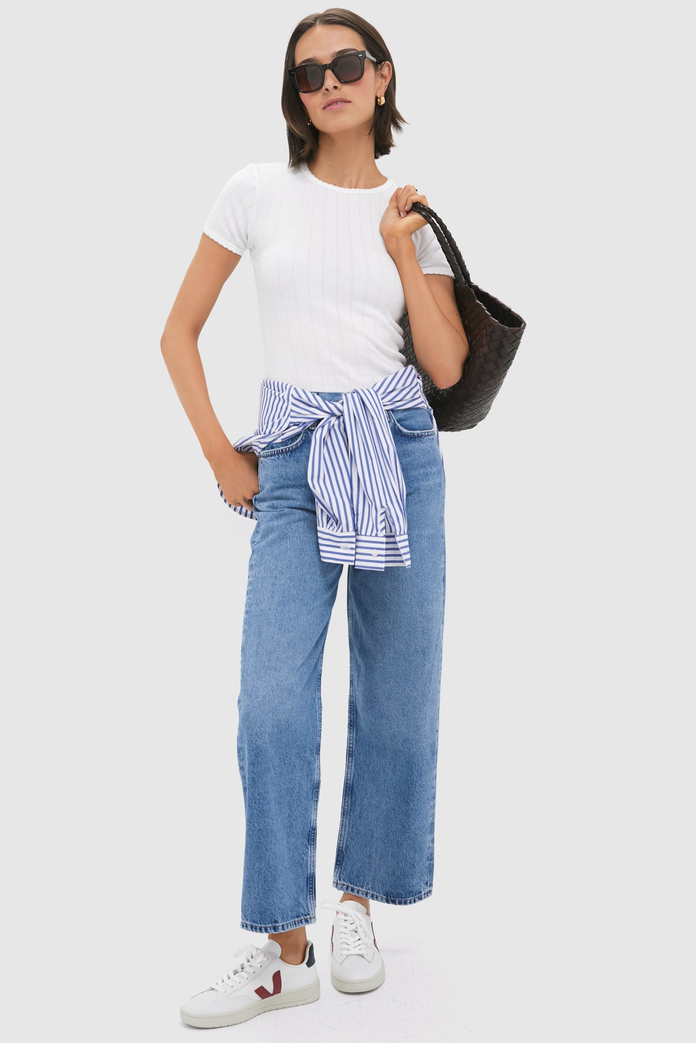 The Shrine Ren Jean is ideal for everyday wear. With a high-rise, wide leg, and clean hem, these jeans are perfect for casual wear. We styled them with a tee, sneakers, and a tote for put together weekend look.