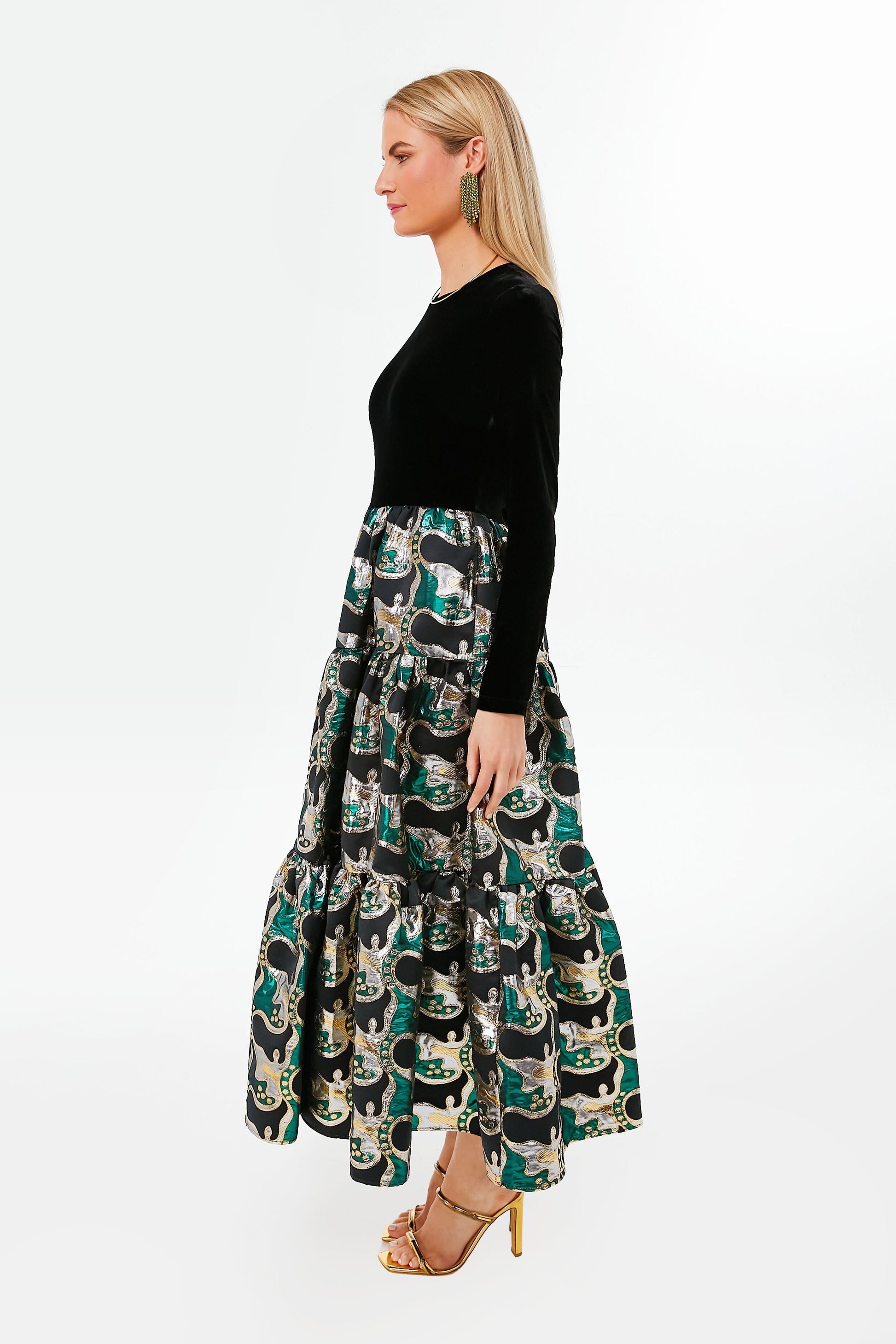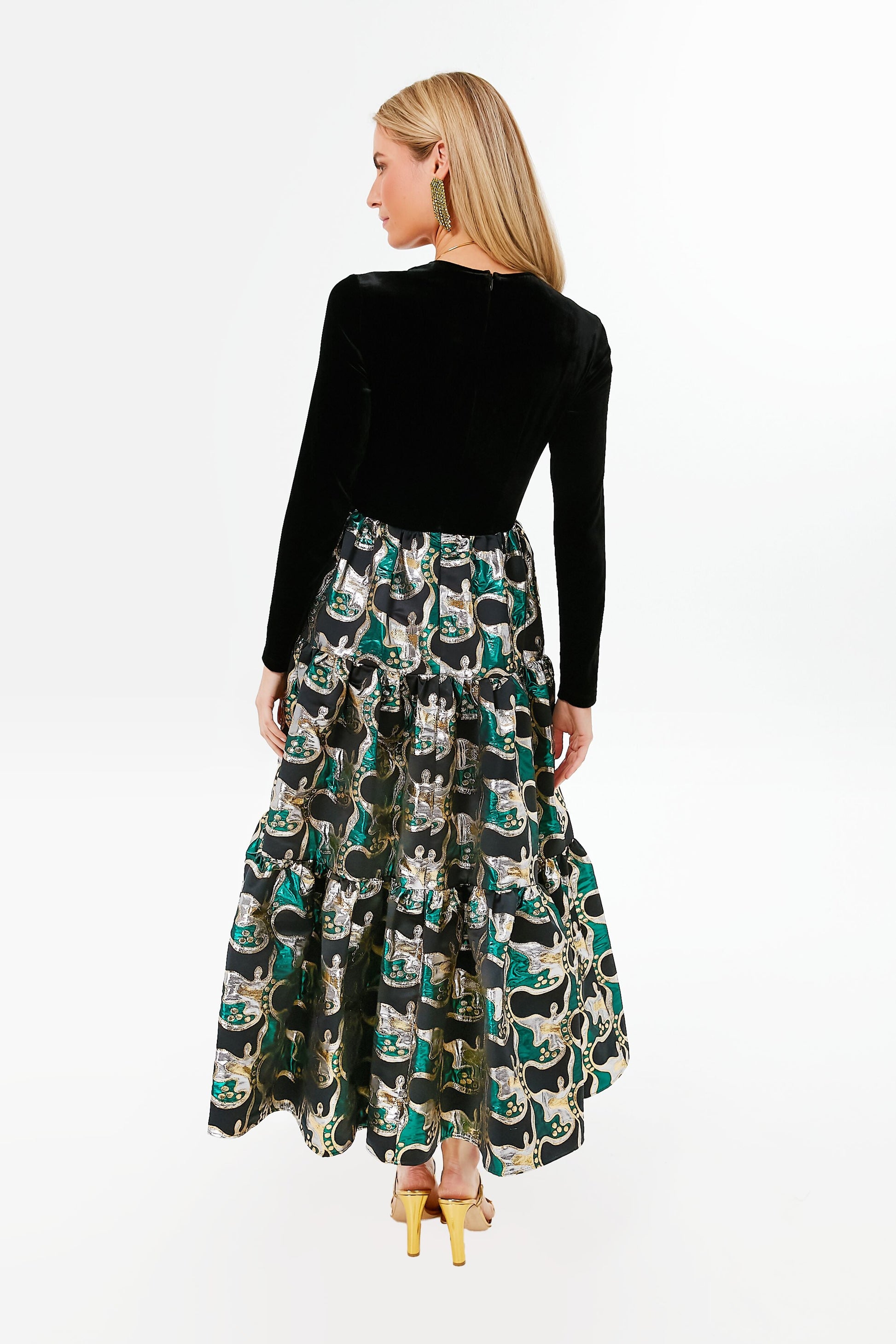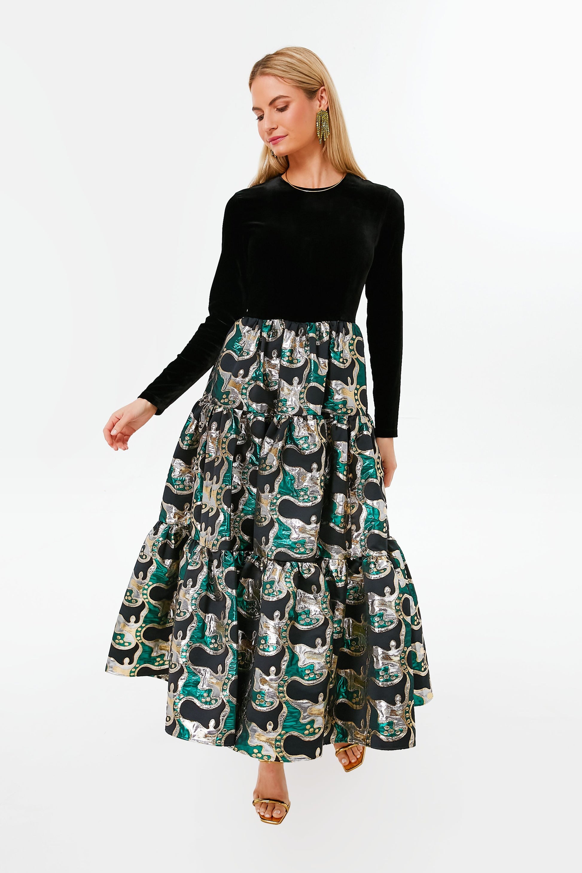 Fancy events can be a source of stress, so why make styling anything but simple? The Spritz Verde Big Dress combines the big eveningwear look of a statement skirt with the ease of throwing on a one-piece frock. This silhouette features a sleek, long-sleeved velvet bodice and flowing tiers of ankle-sweeping jacquard that come together to create a style that is unbearably chic and obviously one of a kind. Add some party pumps and a clutch, then consider your look sorted.