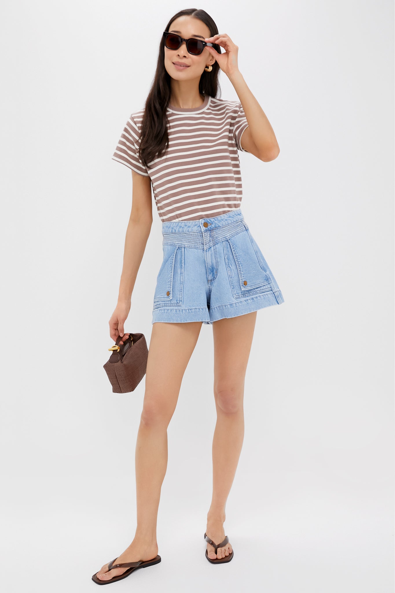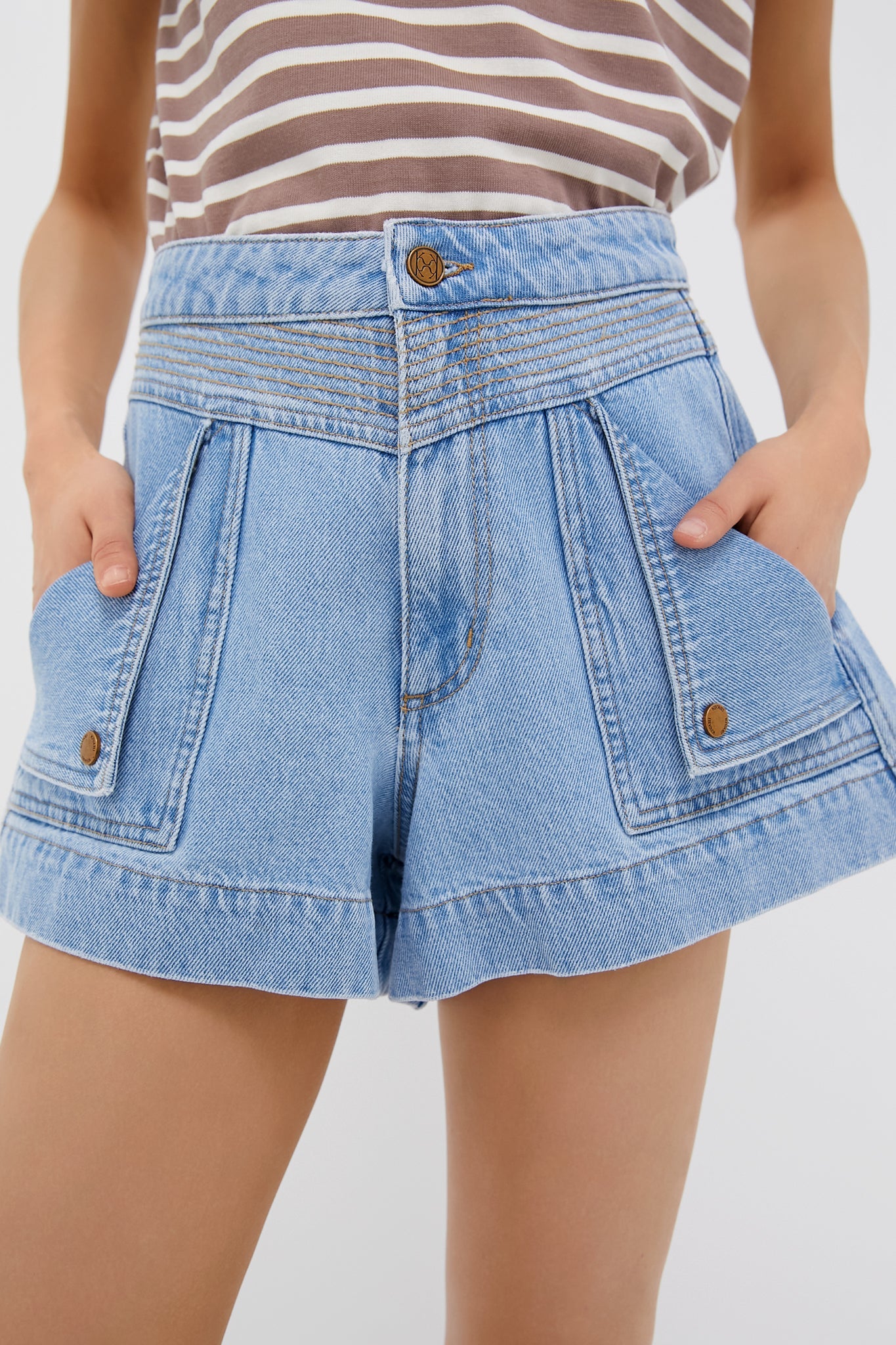 The Celene Denim Short in a light blue stonewash features contrast topstitching and panel detailing, front fold over pockets, complete with antique brass logo hardware. These fashion forward shorts are sure to be a staple in your warm weather wardrobe. Pair with tees or tanks, and sandals or sneakers for a casual weekend look!