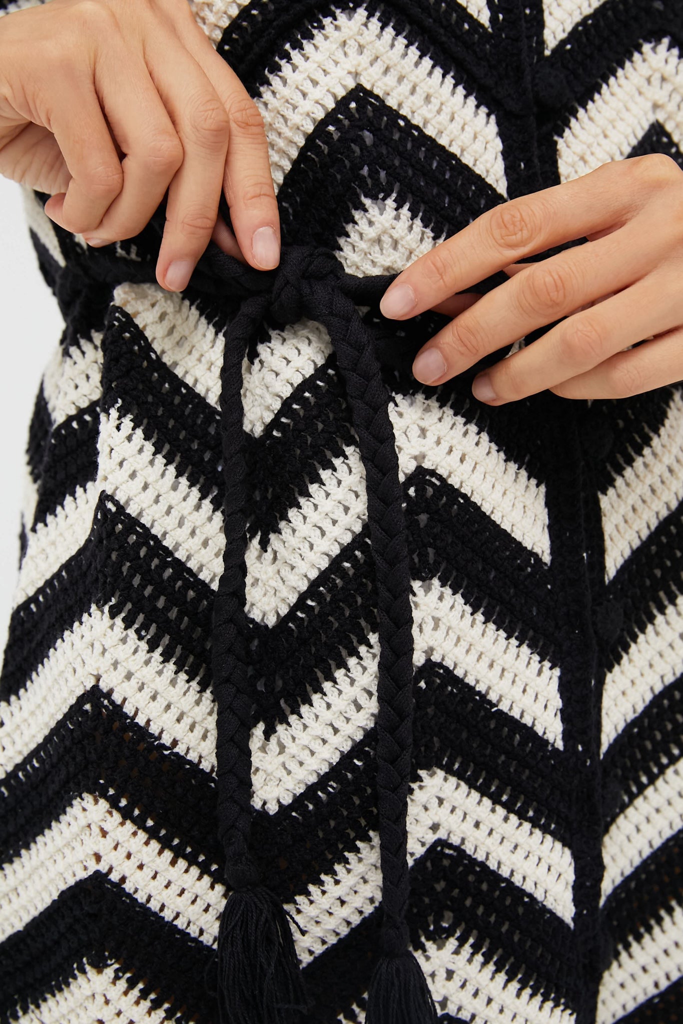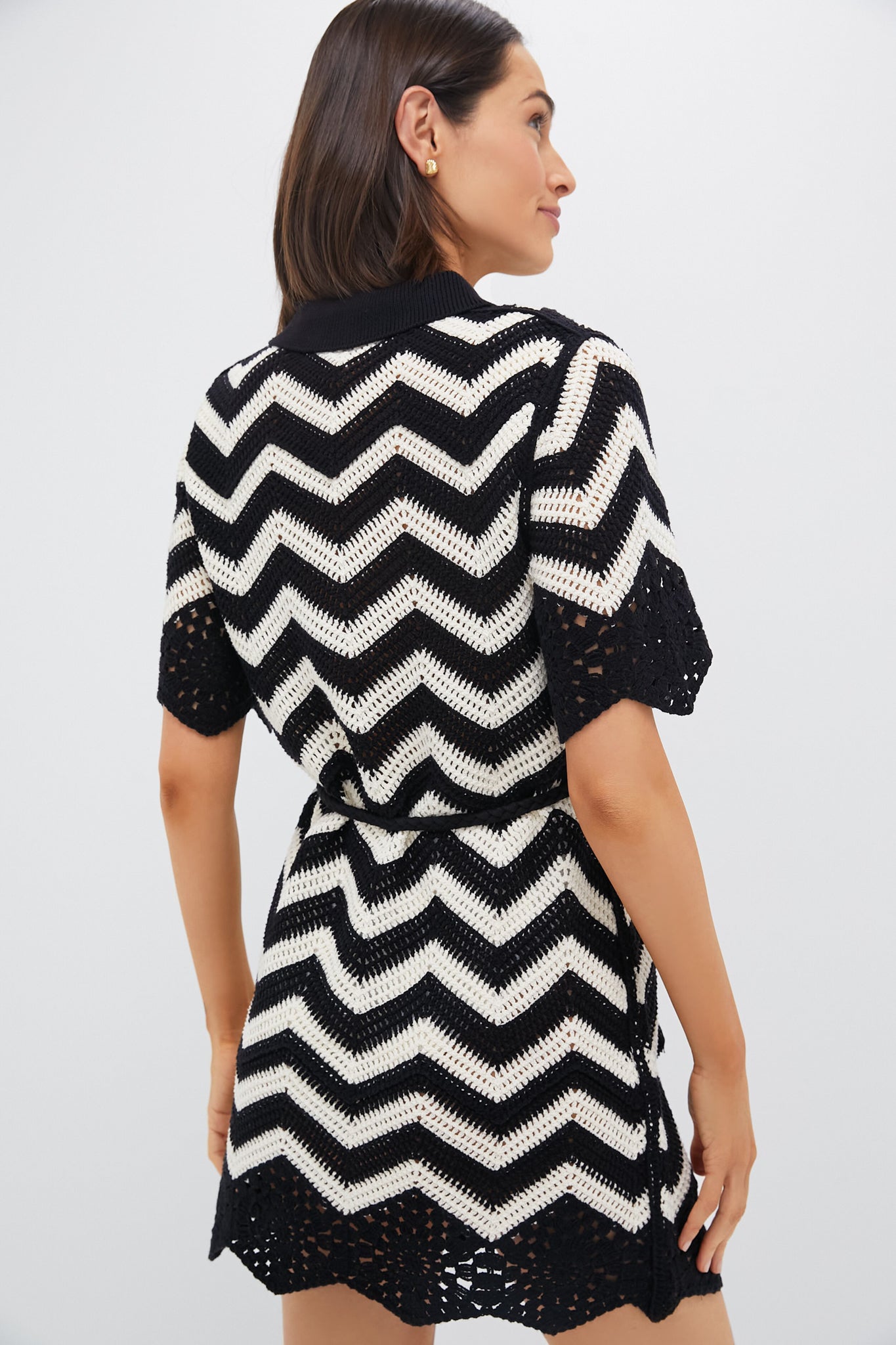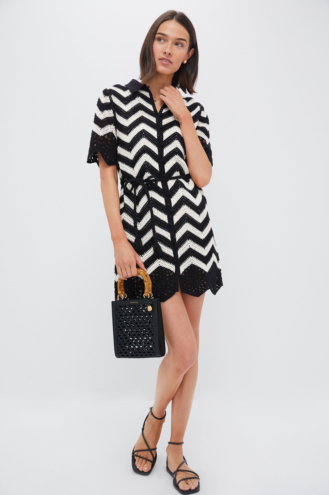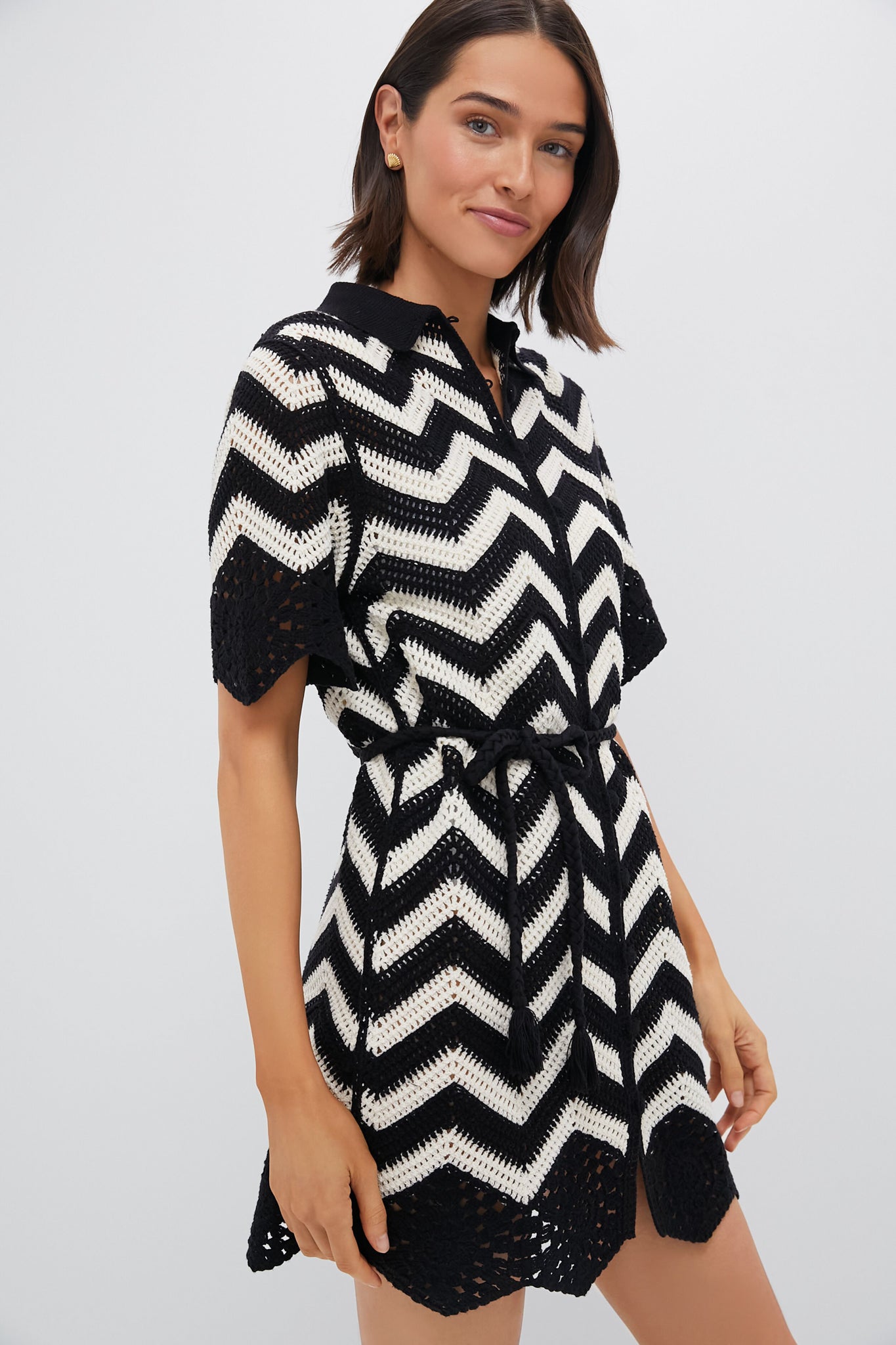 In a black and white chevron design, the Jacinta Mini Dress is a relaxed knit shirt dress silhouette, featuring a button through front and crochet panels at the sleeves and hemline, complete with a removable plaited waist tie.Perfect for lunch with the girls, or throwing on over a bathing suit, pair this versatile shirt dress with tie up sandals or wedges, a raffia clutch, and fun earrings!