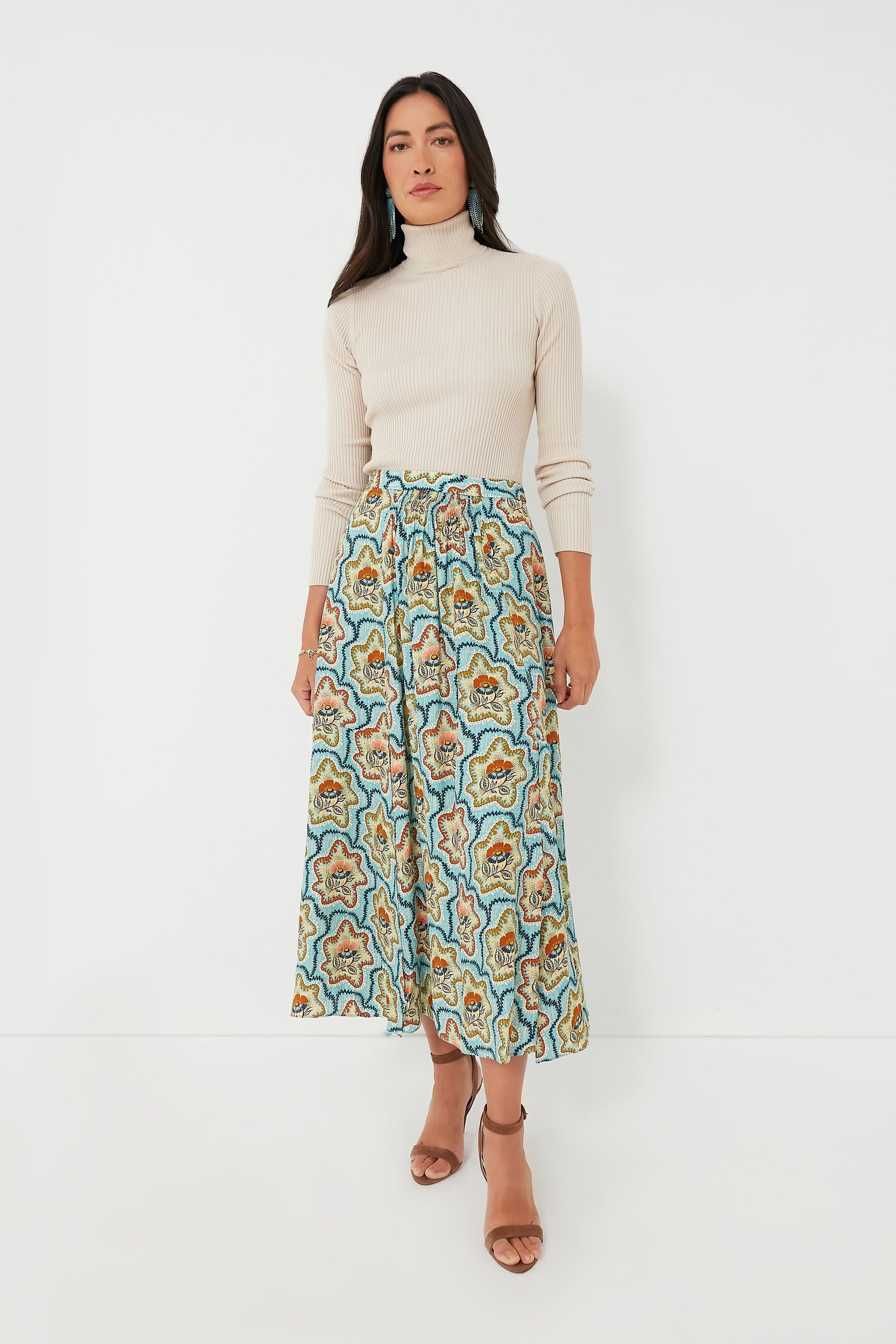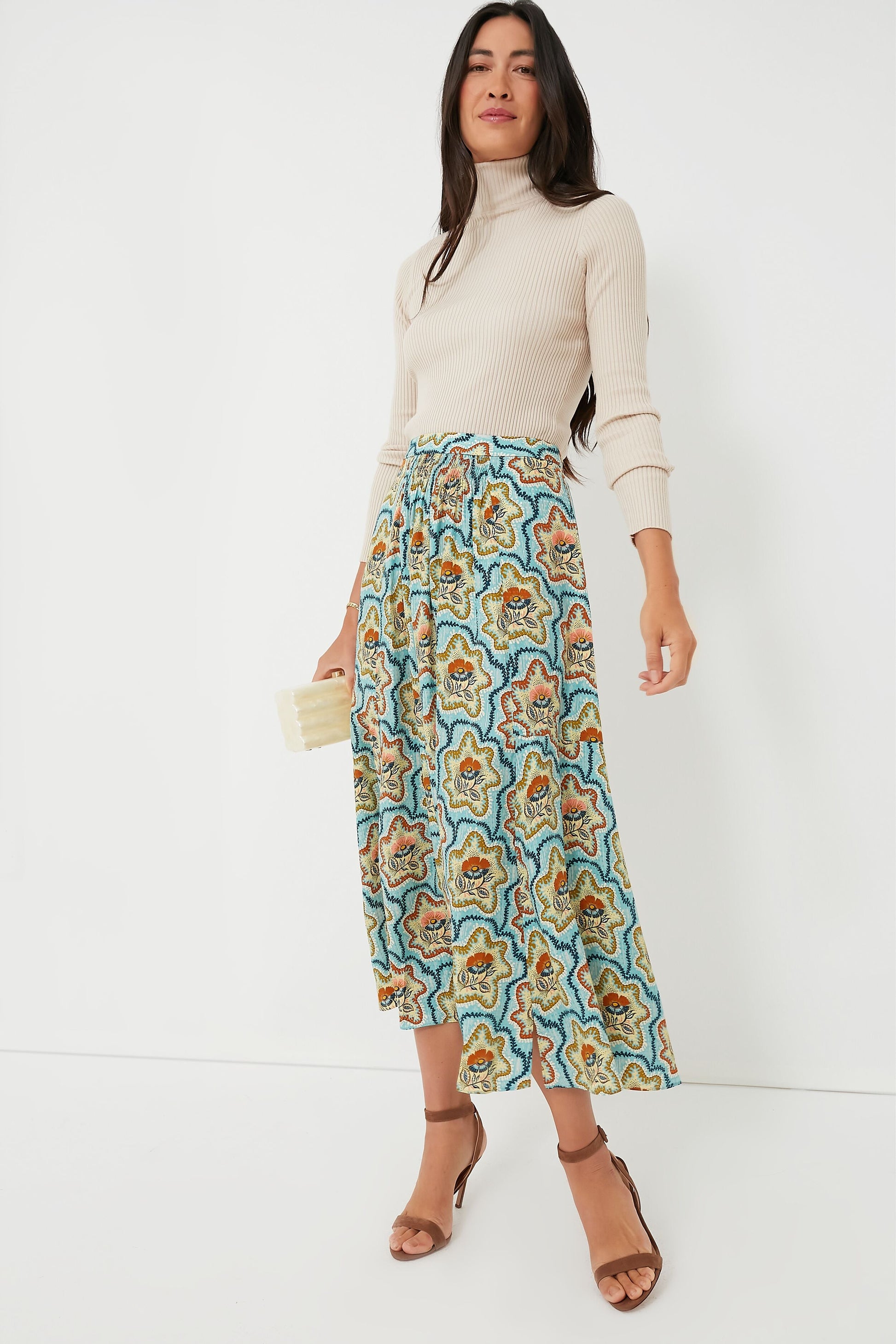 Universally chic, the Tea Time Flower Tucker Skirt is just the style your closet needs. Made from luxe silk, this beauty features a covered waistband, smocking details, and a hidden back zip — though our favorite detail has to be those double slits that allow for breeziness and easy movement. Effortlessly style this transitional piece with a turtleneck or a button down and flats for a classic ensemble, or pair with the matching Graham Top and heels for a stunning statement!
