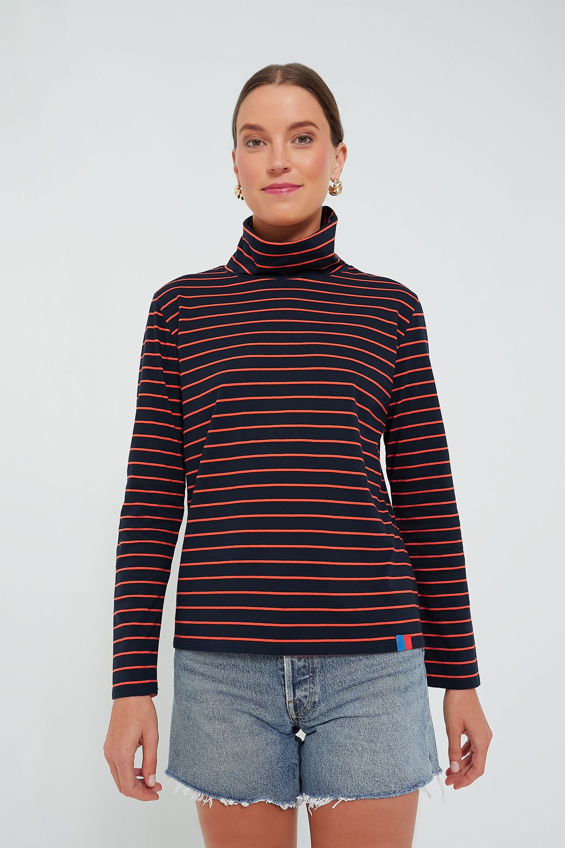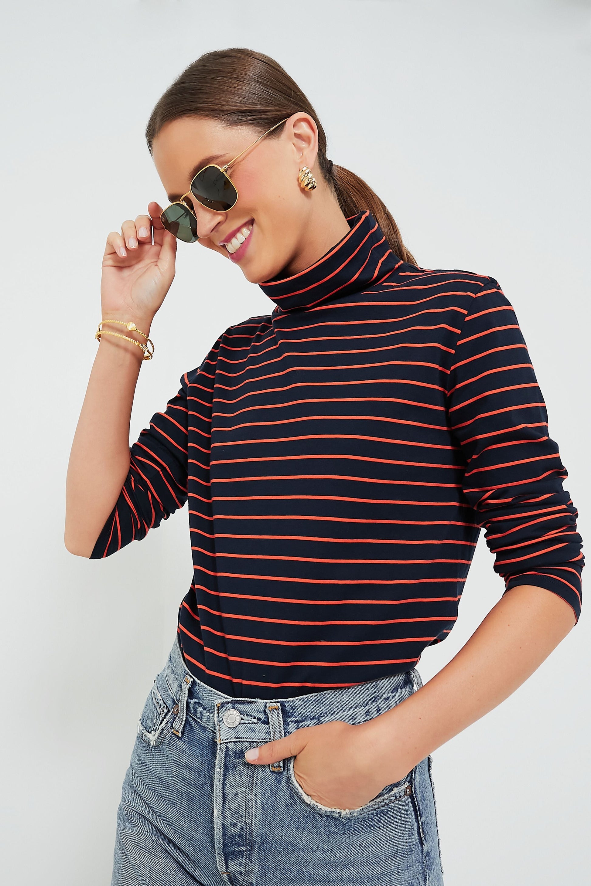 The Navy and Poppy Striped Turtleneck bases its design on the styles worn by Picasso and Brigitte Bardot, with the cozy addition of a high neckline. Featuring a straight cut with a slightly boxy fit, this top is fitted perfectly for a feminine shape yet loose enough for a relaxed look. Made from light cotton, it is the perfect layering piece as the days get cooler, so try it under a cardigan for brunch, under a puffer coat for a walk in the crisp air, or on its own to curl up by the fire.