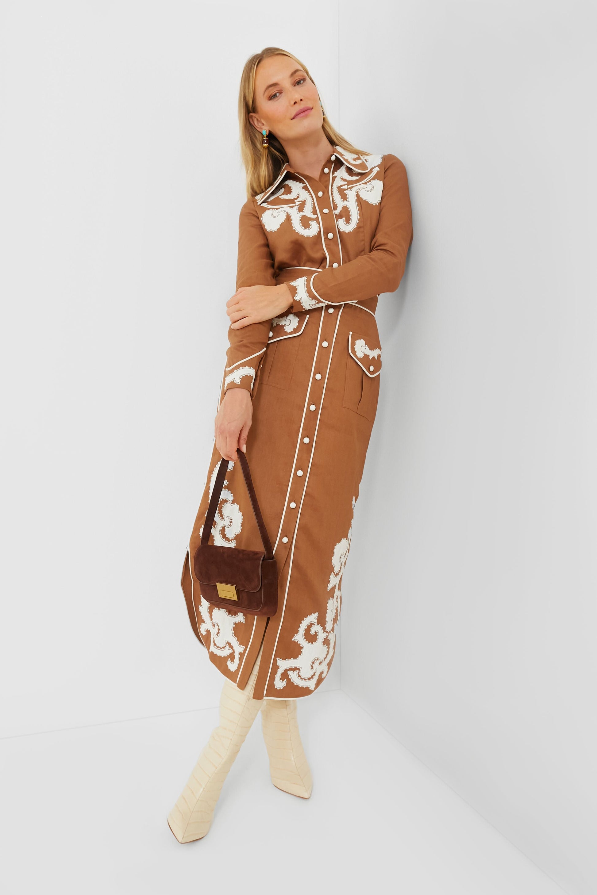 The Tobacco Ruby Applique Skirt is fulfilling all of our cowgirl dreams. This flattering, high-waisted silhouette features pleated flap pockets at the hips, a front placket with covered buttons, and gorgeous handmade applique detailing that we love. Pair with the matching Ruby Shirt for a stunning statement at your next event, or style with a neutral top and boots for a playful office ensemble.