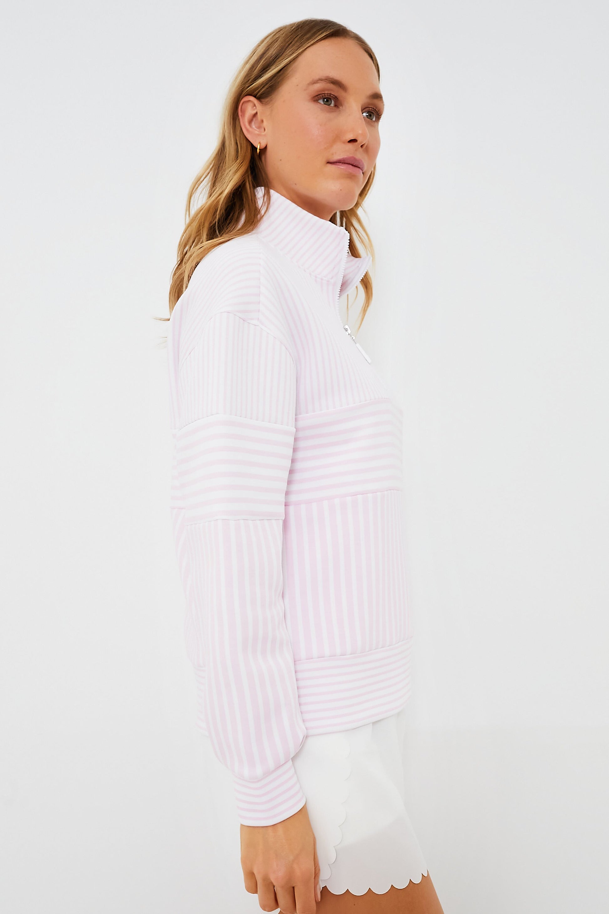 Perfect for a post-workout chill sesh, the Varsity Quarter Zip is a relaxed-fitting layer piece with a quarter zip closure. Made in a pastel pink color with contrast stripe panels, you can easily look put-together or comfy-cozy in this style, simply switch from leggings to denim and you're ready to go from the barre to the bar!