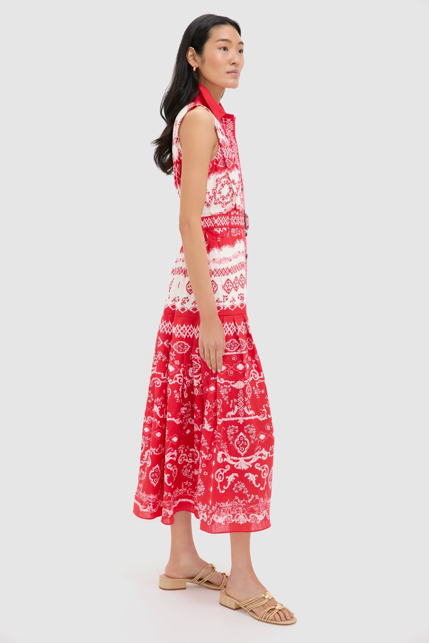 The Vermilion Riveria Nya Dress blends ease and elegance with its sleeveless shirt-dress silhouette and softly pleated full skirt. The tonal fabric belt offers a flattering fit, perfect for garden parties, seaside dinners, or breezy weekends. Pair with espadrilles or flats for a timeless, comfortable look.