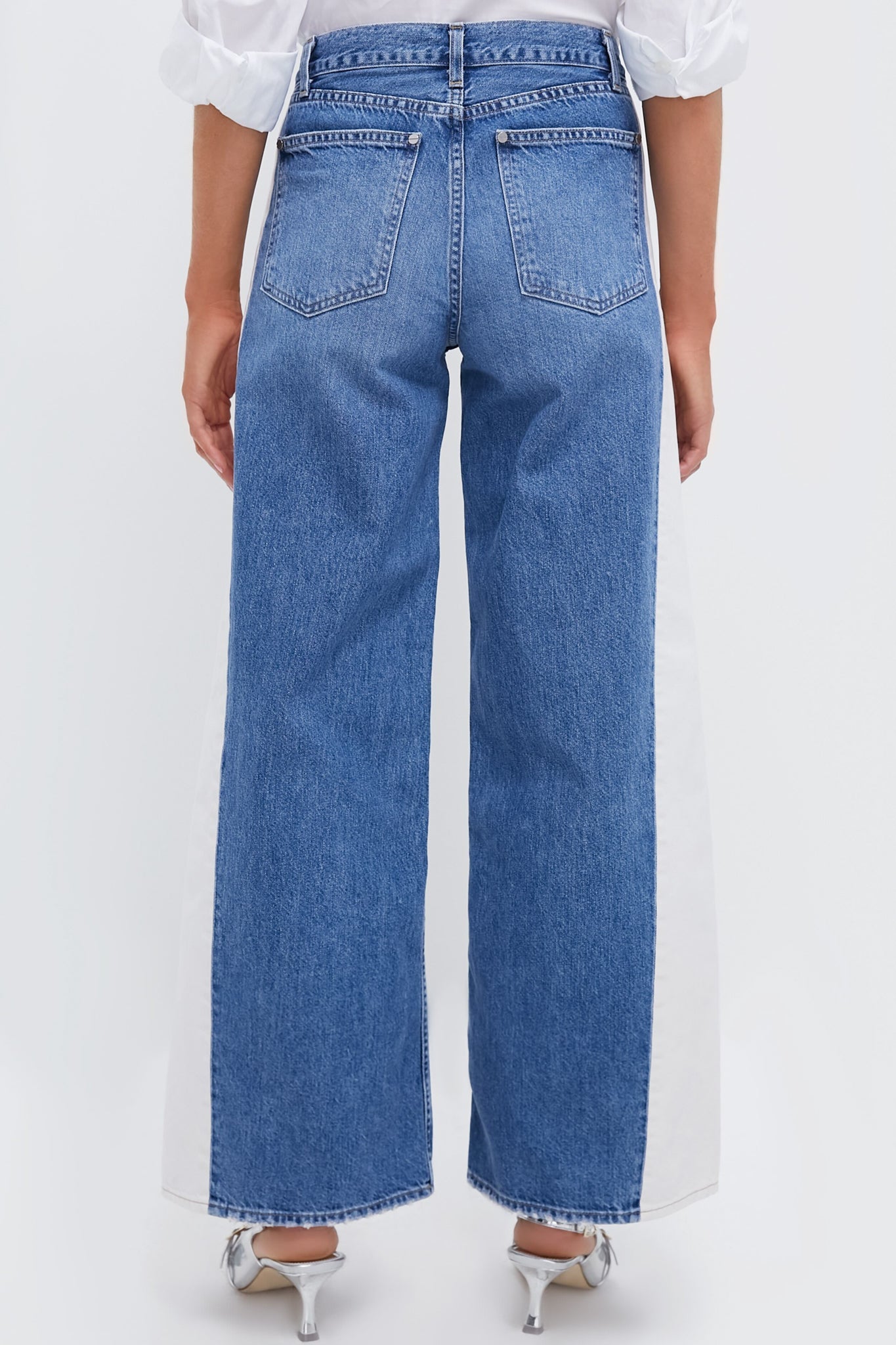 The Vintage Wash and White Ramblin' Man Jean is a mid-rise, wide leg jean in two tone denim. With a relaxed hip and a five-pocket style detailed with nail head rivet hardware, we recommend pairing with a crisp white button down shirt, silver heels, and a clutch!