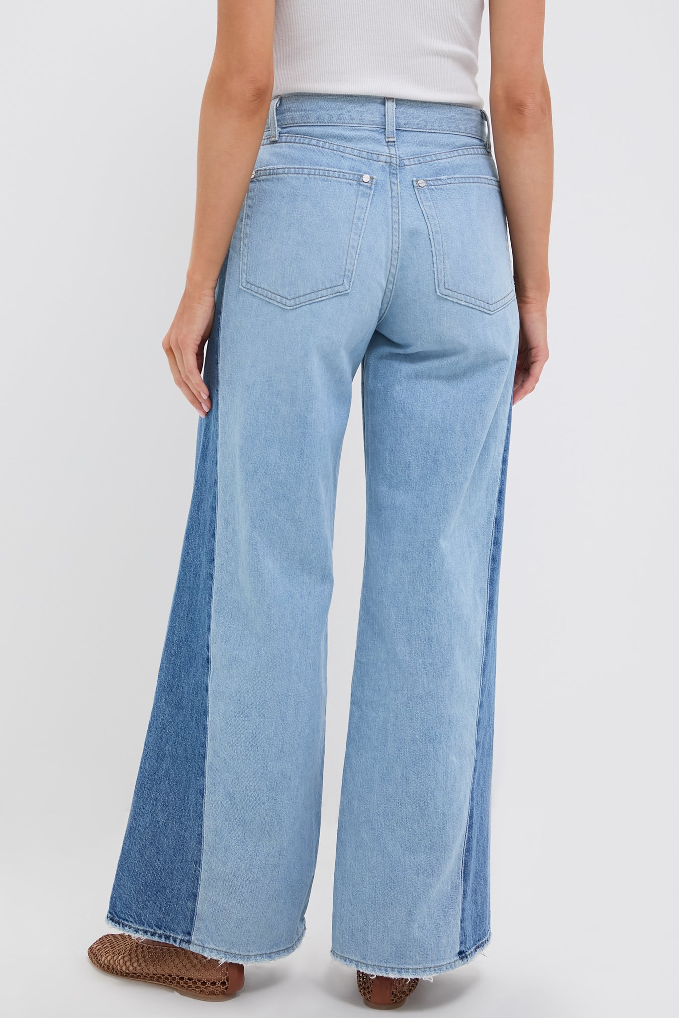 The Vintage Wash Two Tone Ramblin Man Jeans are a mid-rise, wide leg jean in two tone denim. With a relaxed hip and a five-pocket style detailed with nail head rivet hardware, we recommend pairing with tees, tanks, or buttons downs, flats or sandals, and your favorite bag!