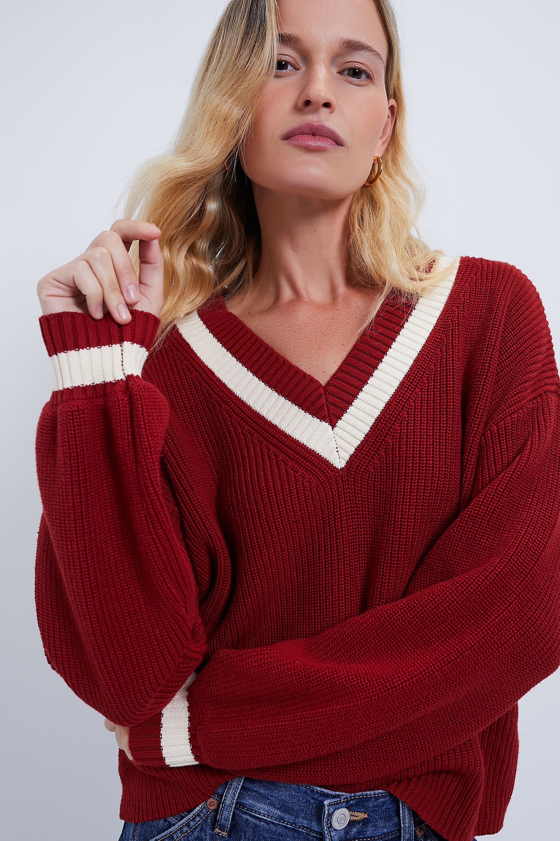 - Contrast striped ribbed neckline