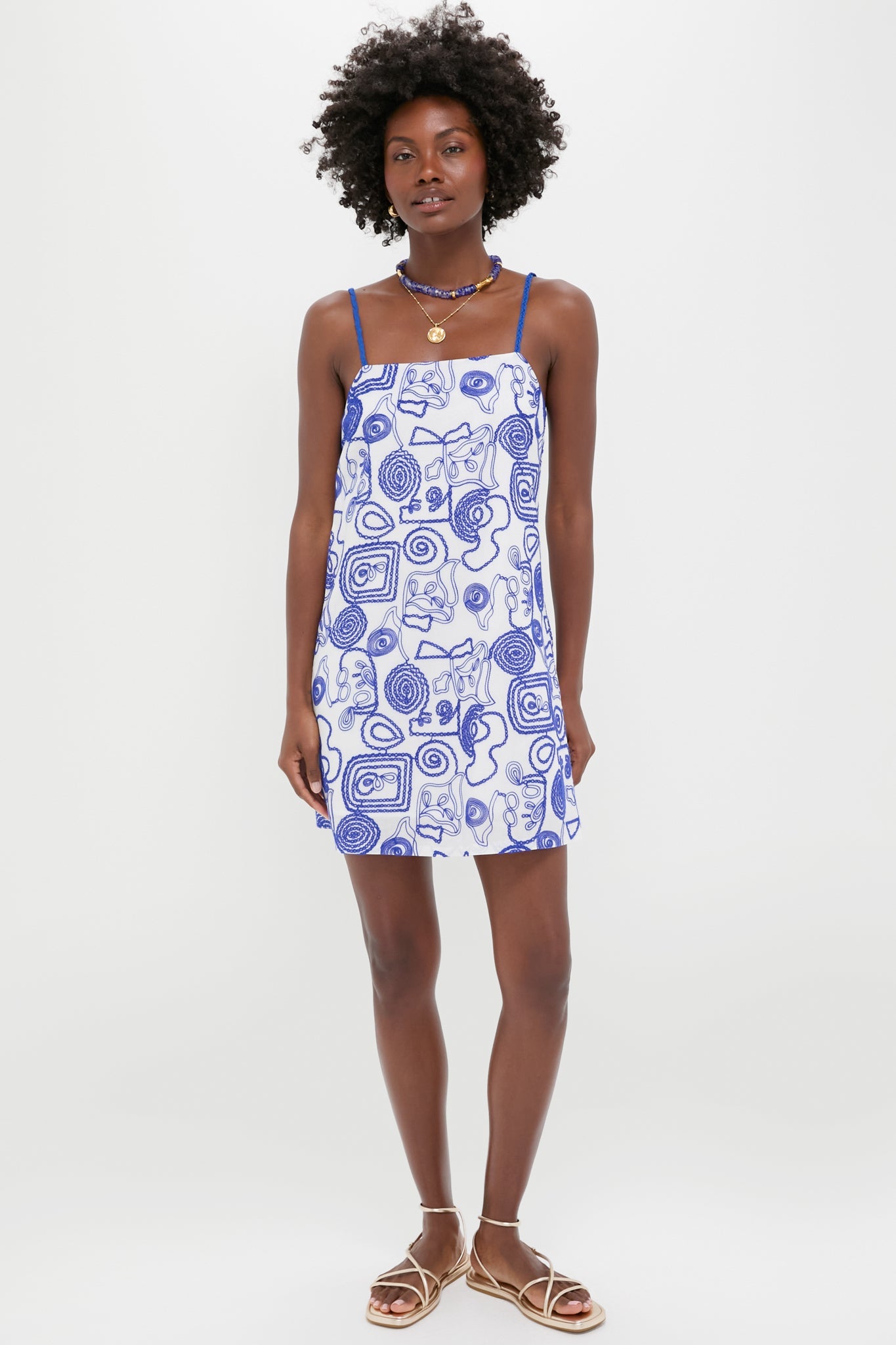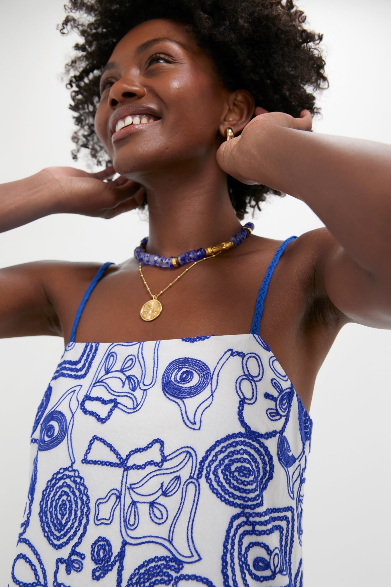The Santorini Dress boasts an easy A-line silhouette with abstract royal blue detailing throughout and adjustable braided straps. Perfect for weekend trips and shopping days, we are styling this with sandals and fun jewelry for a playful warm-weather look!