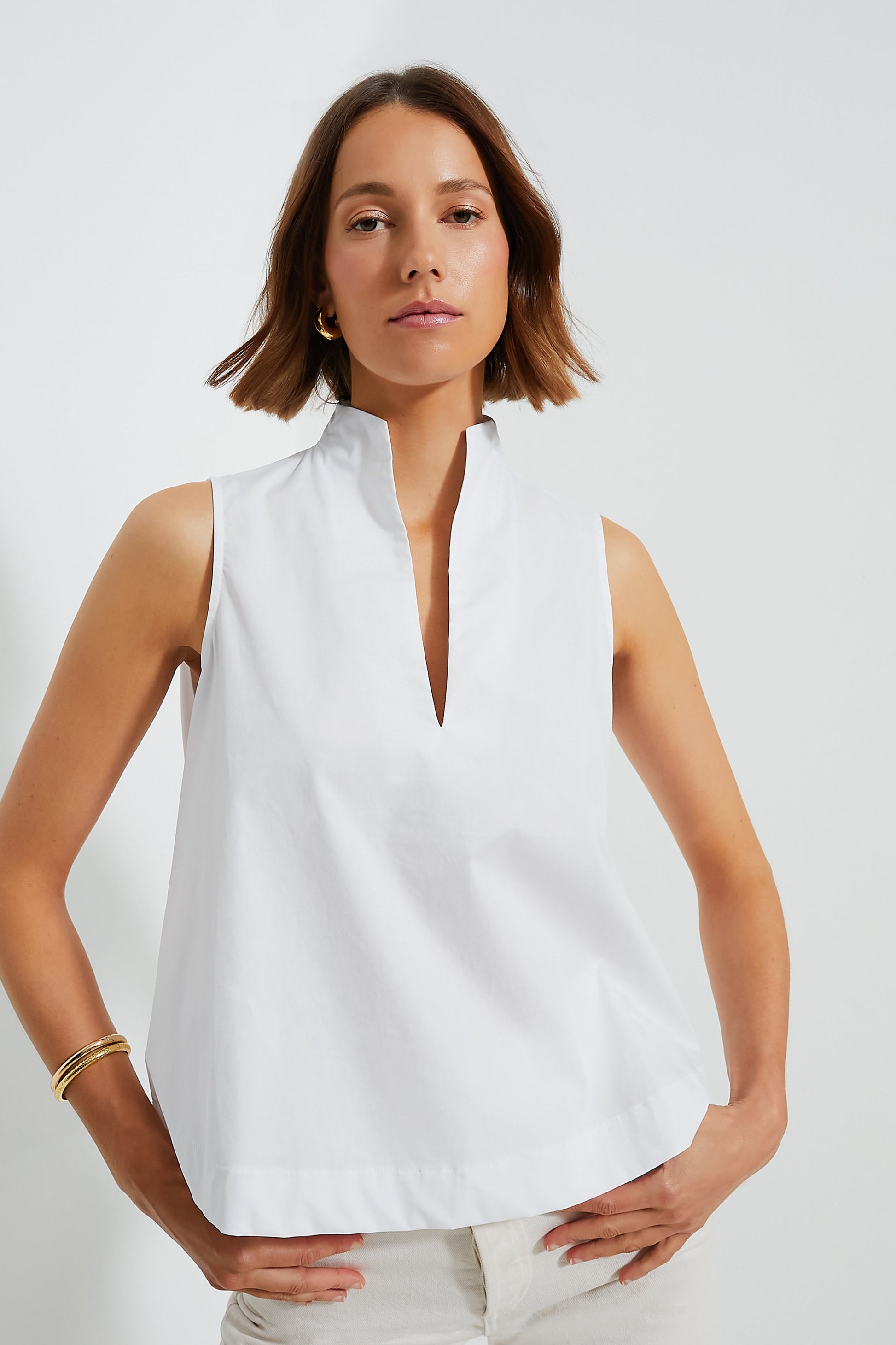 The White Celeste Top is a season-less piece to add to your wardrobe. Featuring a sleeveless silhouette with a flattering v-neck and swingy hem, this chic number is equally appropriate for work and play. We love to pair it with a sweater thrown over the shoulders, jeans, and sneakers for an effortless cool-girl look.