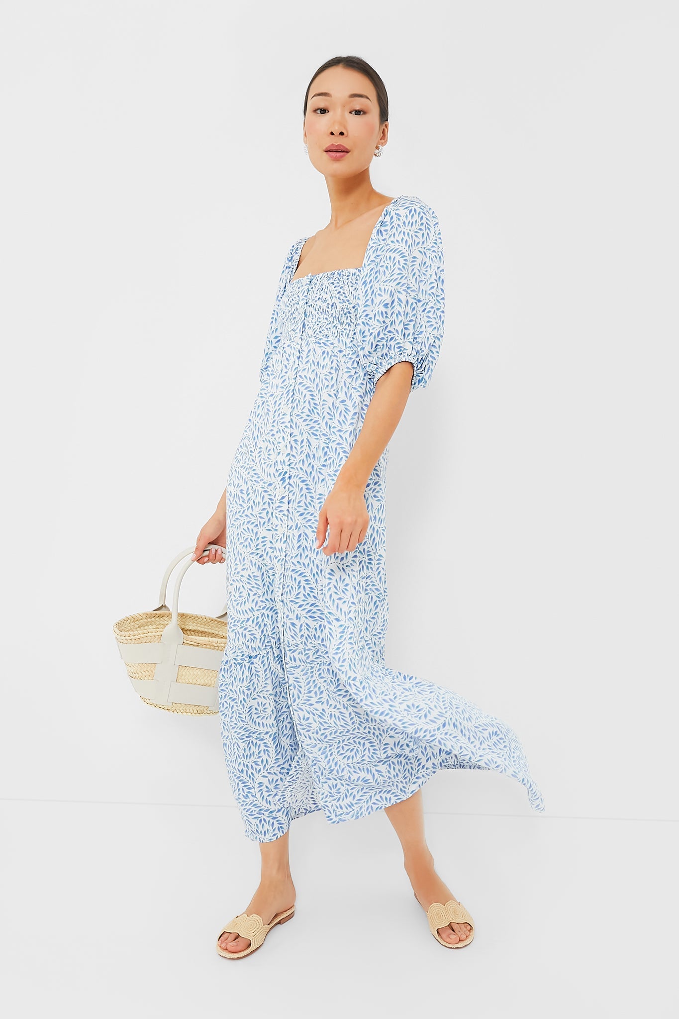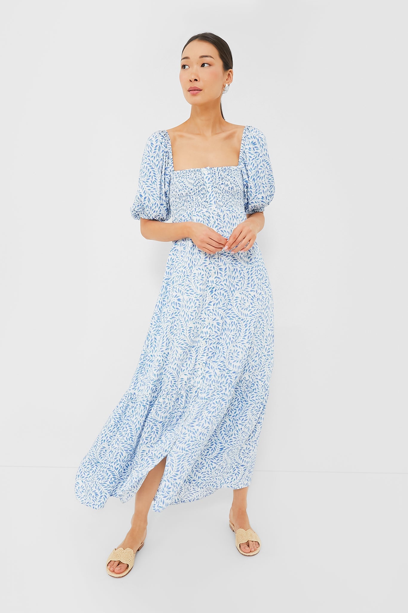 Romantic, feminine, and breezy, we are obsessing over the Wisteria Vines Santiago 3 Short Sleeve Dress. This maxi features a square neckline, short puff sleeves, a smocked bodice, and a wide ruffle hem. The enchanting blue vines that swirl around the white background add a charming touch. Pair with sandals or heels and add a pair of pearl earrings for a sweet addition.